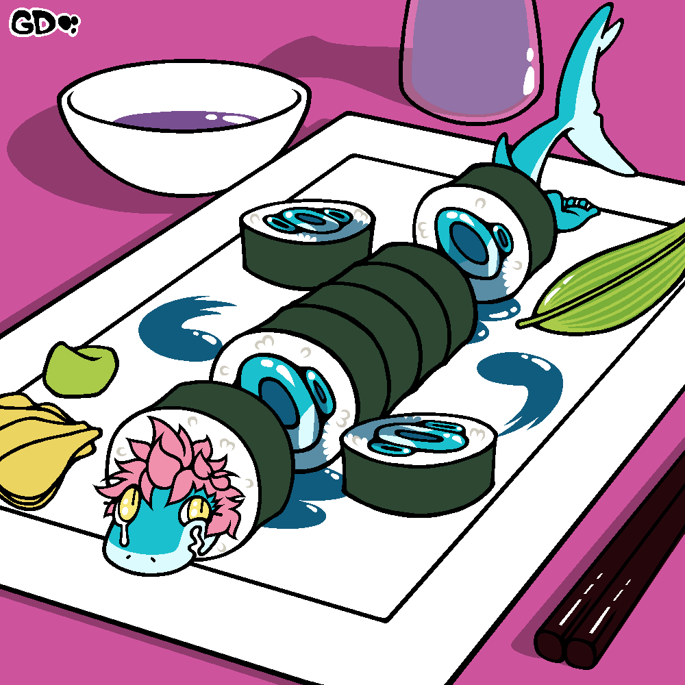 You decide to forego the single, diminutive bar stool in favor of the floor, but you’re still a bit too big to sit comfortably. He apologizes and offers you some tea. Even standing at full height, he barely meets your chin. You glance behind the bar as he pours, observing an impressive variety of glistening, fluorescent cuts of meat, none of which you can identify as fish. You’re not entirely sure it’s meat. He catches you peeking and grins, asking if you know what you’d like. You down the curiously small cup in a single gulp and decide to live dangerously, ordering the omakase. His eyes light up, and he motions for you to wait as he slips behind a curtain into the back.